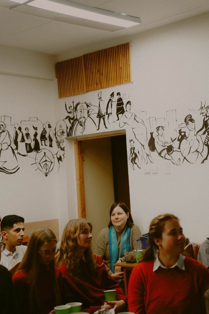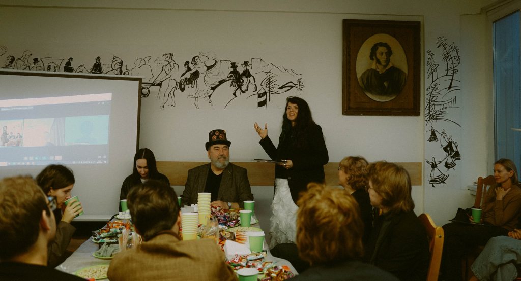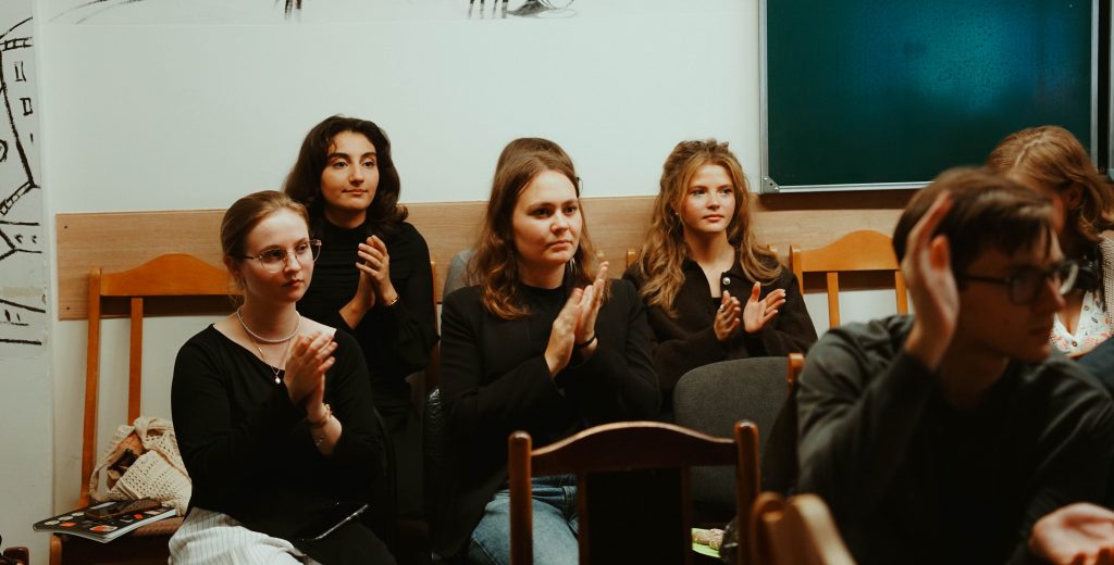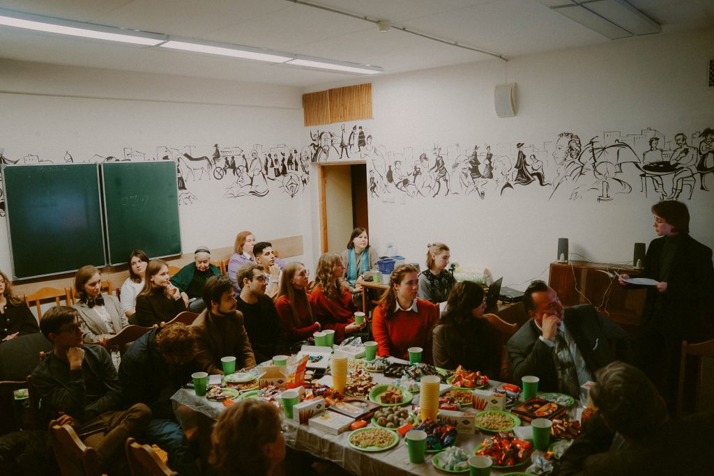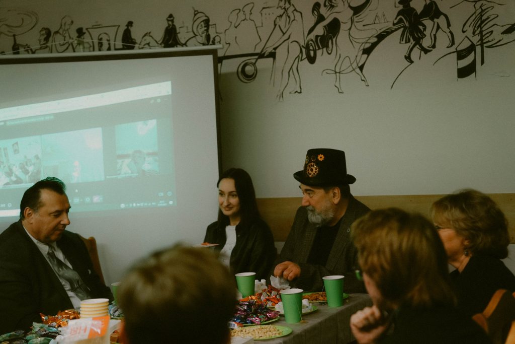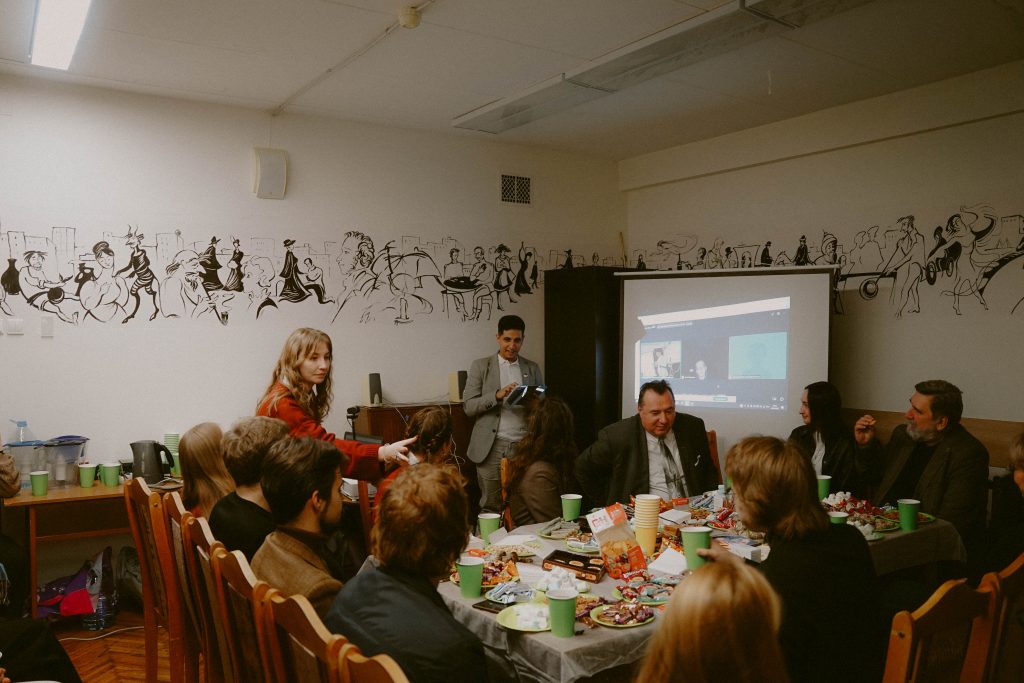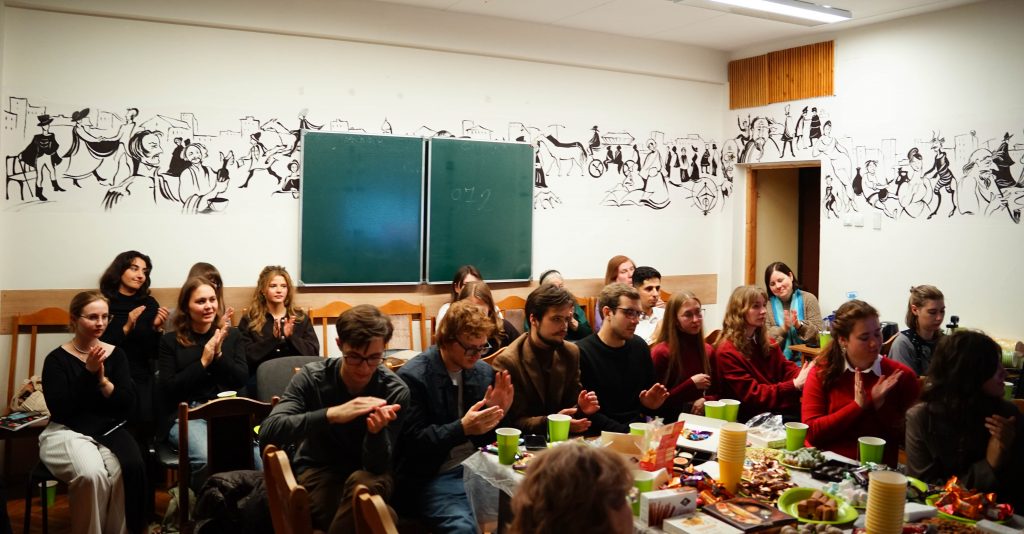 15 апреля 2024 г. преподаватель Е.В. Жуйкова совместно с коллективом сотрудников, аспирантов и магистрантов кафедры провела вечер в стиле «Бродячей собаки». Программа получилась необыкновенно яркой и насыщенной; наряду с докладами, были представлены пантомима, танцы, театр теней, интермедии и многое другое. Гости с организаторами совместно исполнили гимн «Бродячей собаки», полаяли и оставили памятные надписи в свиной книге, единогласно придя к решению о необходимости регулярных собраний подобного рода.